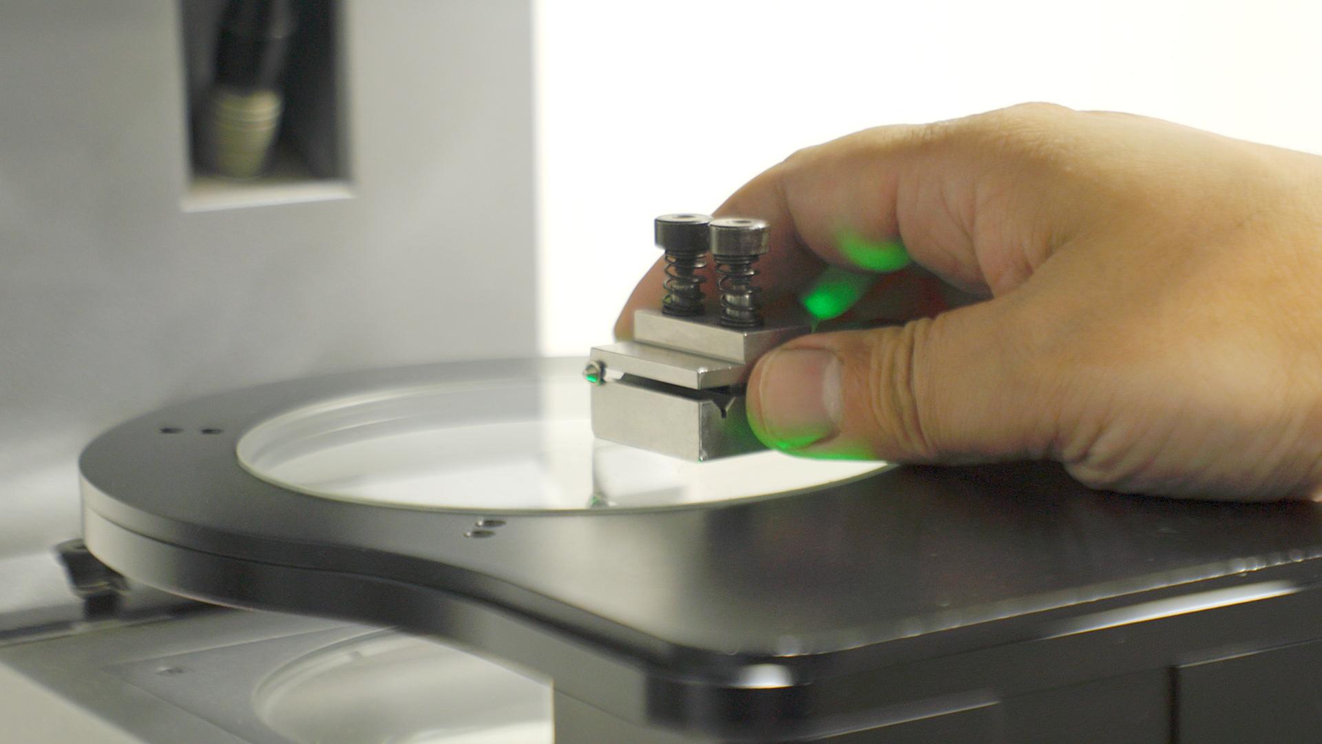 簡単な作業でワークの形状をイメージで登録を行い、そのワークをガラスの上に乗せて、適当にピントを合わせて測定ボタンを押すだけで各部の寸法を瞬時に測定が終了します。